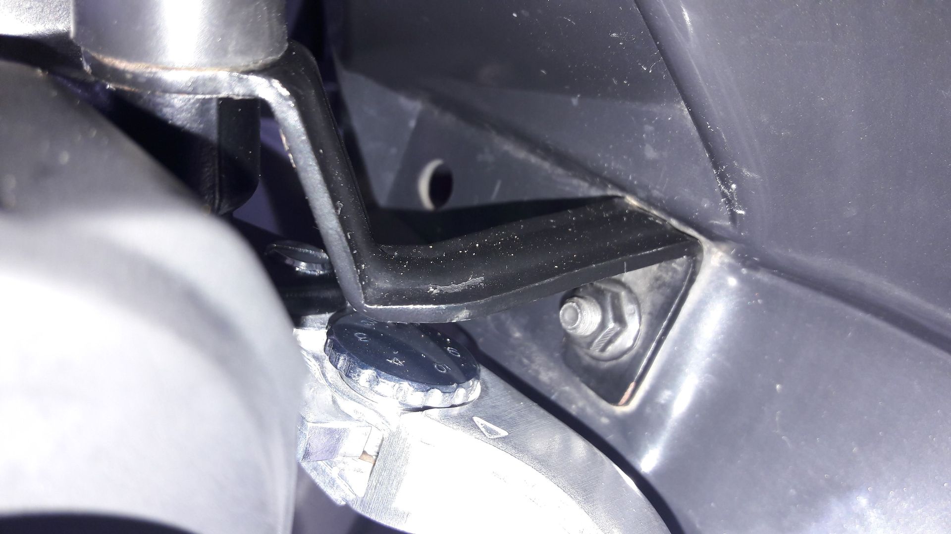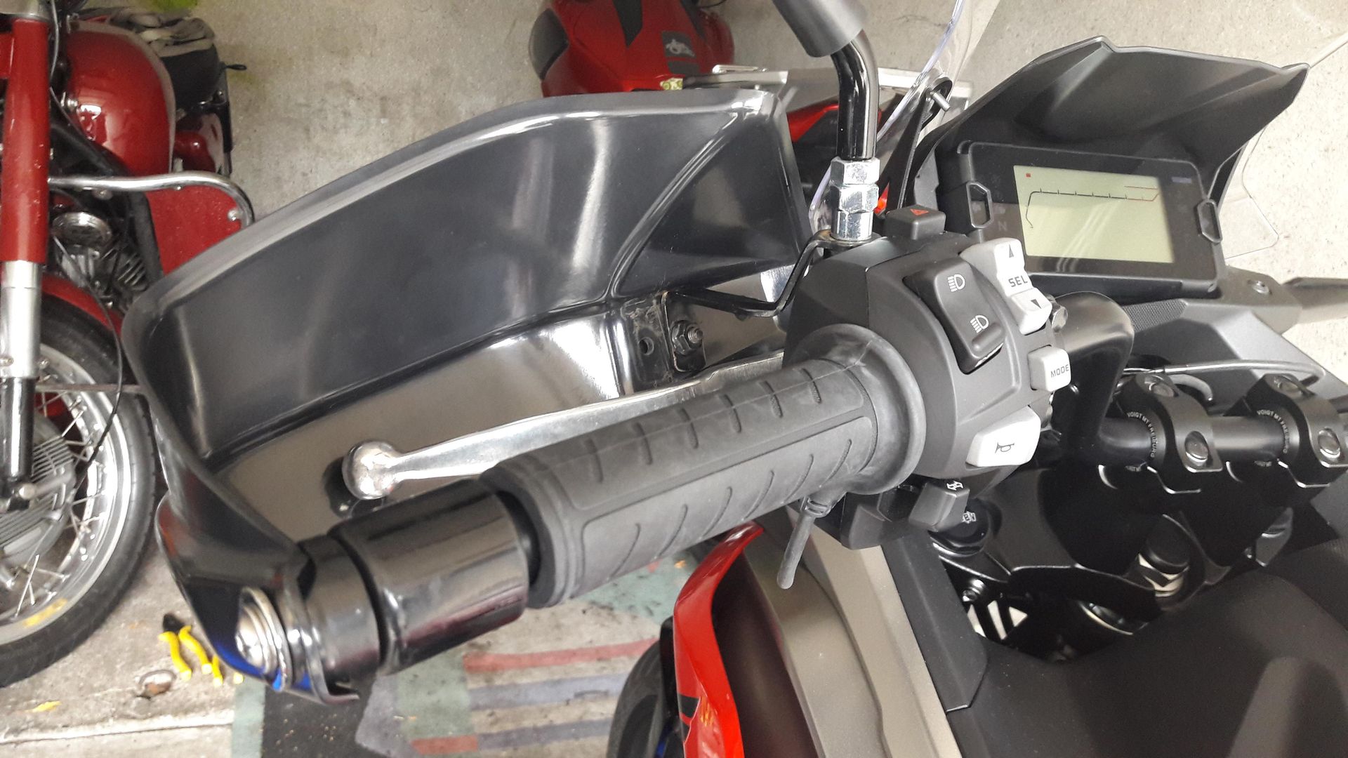 Die Handprotektoren sind von Givi und waren an meiner vorherigen NC montiert. Ich hatte sie gekürzt so dass sie um 25 mm näher an den Lenker herankommen. Dafür war die Bohrung zur Halterung am Lenkerende und die Haltebleche am Rückspiegel zu verändern. Der Kupplungshebel kommt jetzt gerade eben an den linken Handprotektor, mal schauen wie sich das im Fahrbetrieb auswirkt. Vielleicht schau ich da noch nach einem anderen Kupplungshebel.