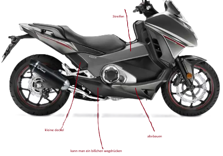 Nach dem üblichen "Plastik weg", die Streifen welche die Sitzbank vorn entlang laufen und die beiden kleinen Seitendeckel am Schrägrohr und die vordere, untere Trittbrettverkleidung.