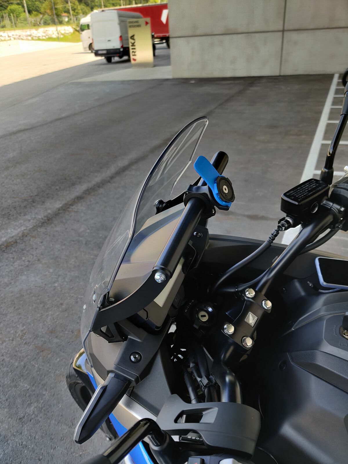 anfangs fuhr ich mit einer Quadlock Halterung an der linken Seite des Lenkers umher, doch schnell kam der Wunsch auf das Smartphone im direkten Blickfeld zu haben.
