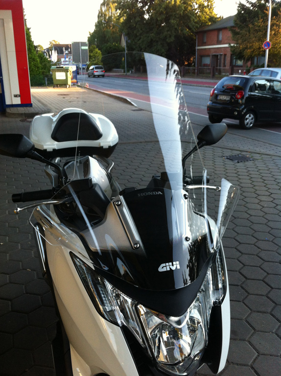Aber is scho Recht (wie der Bayer sagen würde). Nur was Givi da macht, so ein häßliches Ding mit dem schwarzen Rand (warum nicht wenigstens farblos, wenn schon der Kantenschutz sein muss, obwohl die Original-Honda-Scheibe auch keinen Kantenschutz hat) und dann stillschweigend auf die gleiche Höhe wie die Honda-Scheibe absägen: das geht gar nicht!