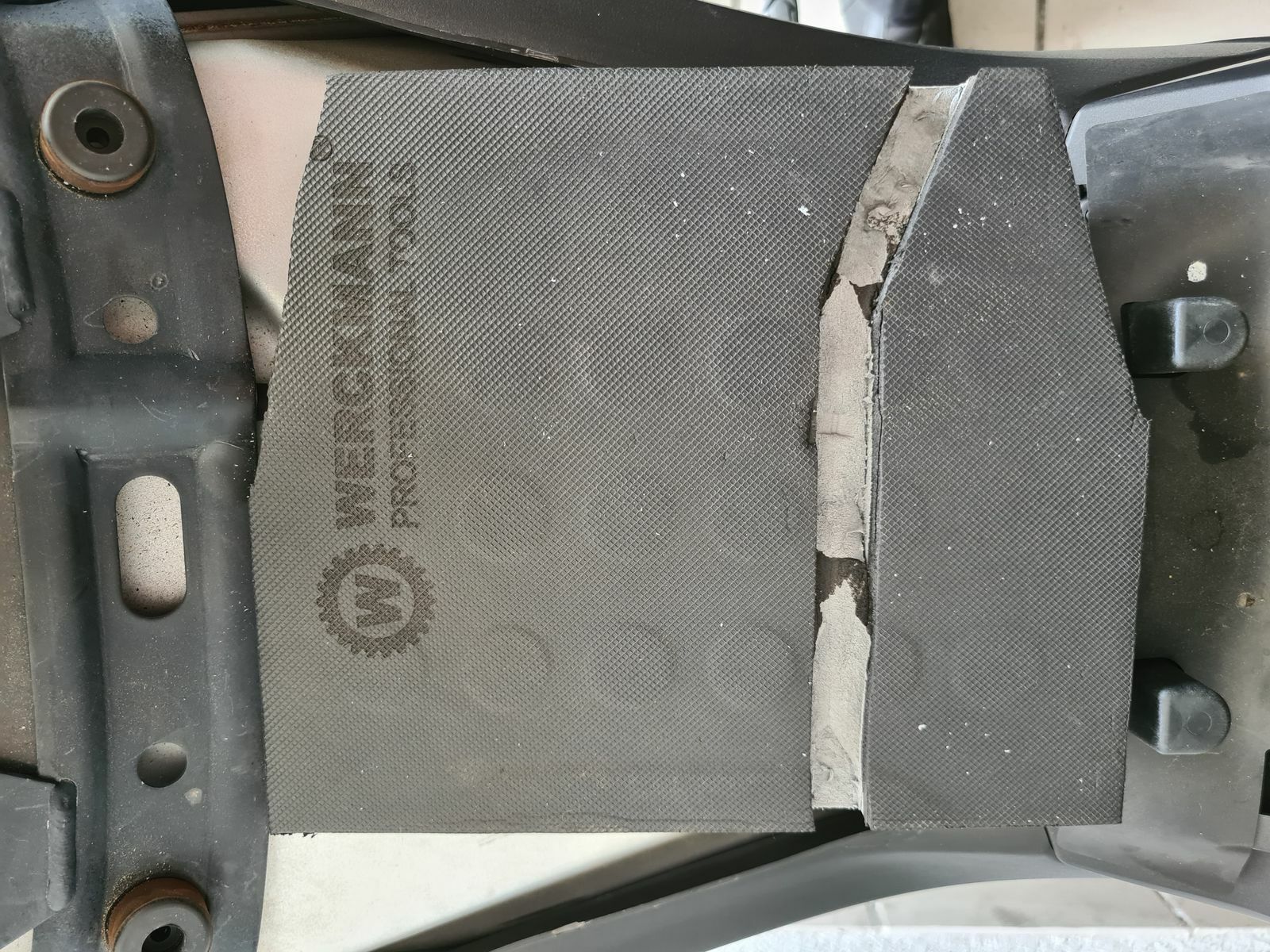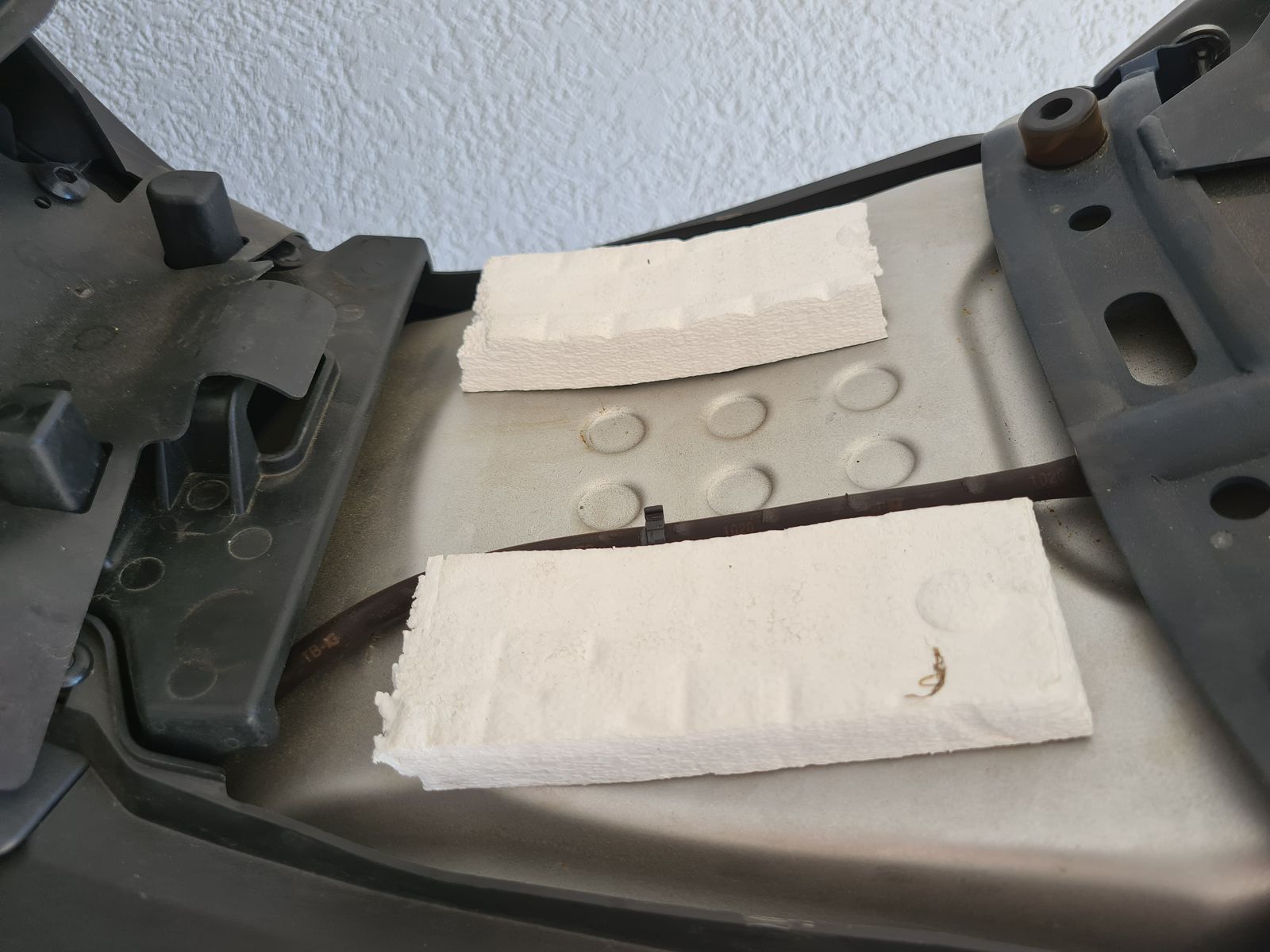 An der Unterseite einen Kanal für den Gummischlauch reingeschnitten und von der Höhe solange reduziert bis ich den Sitz in der Originalposition montieren konnte.