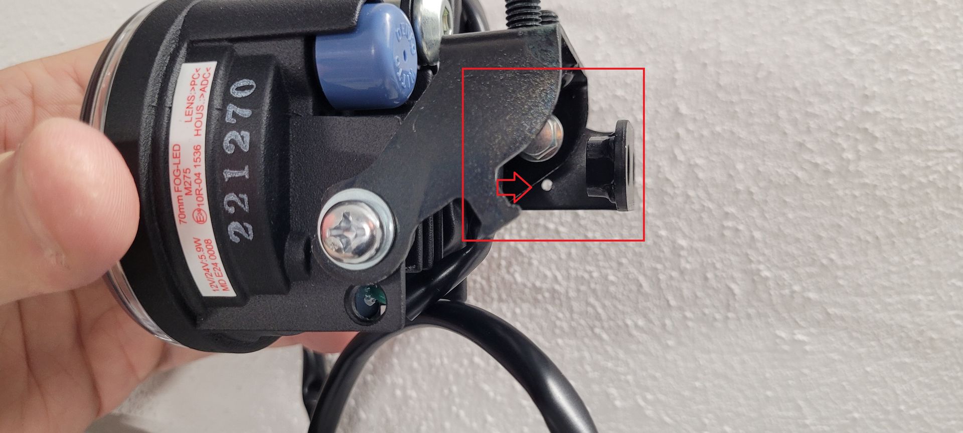 Zum vergrössern, einfach auf das Bild klicken, dann seht ihr das dort ein kleines Loch ist, das muss bündig mit der Halterung verschraubt werden. Damit stellt man die Höhe des Scheinwerfers ein.