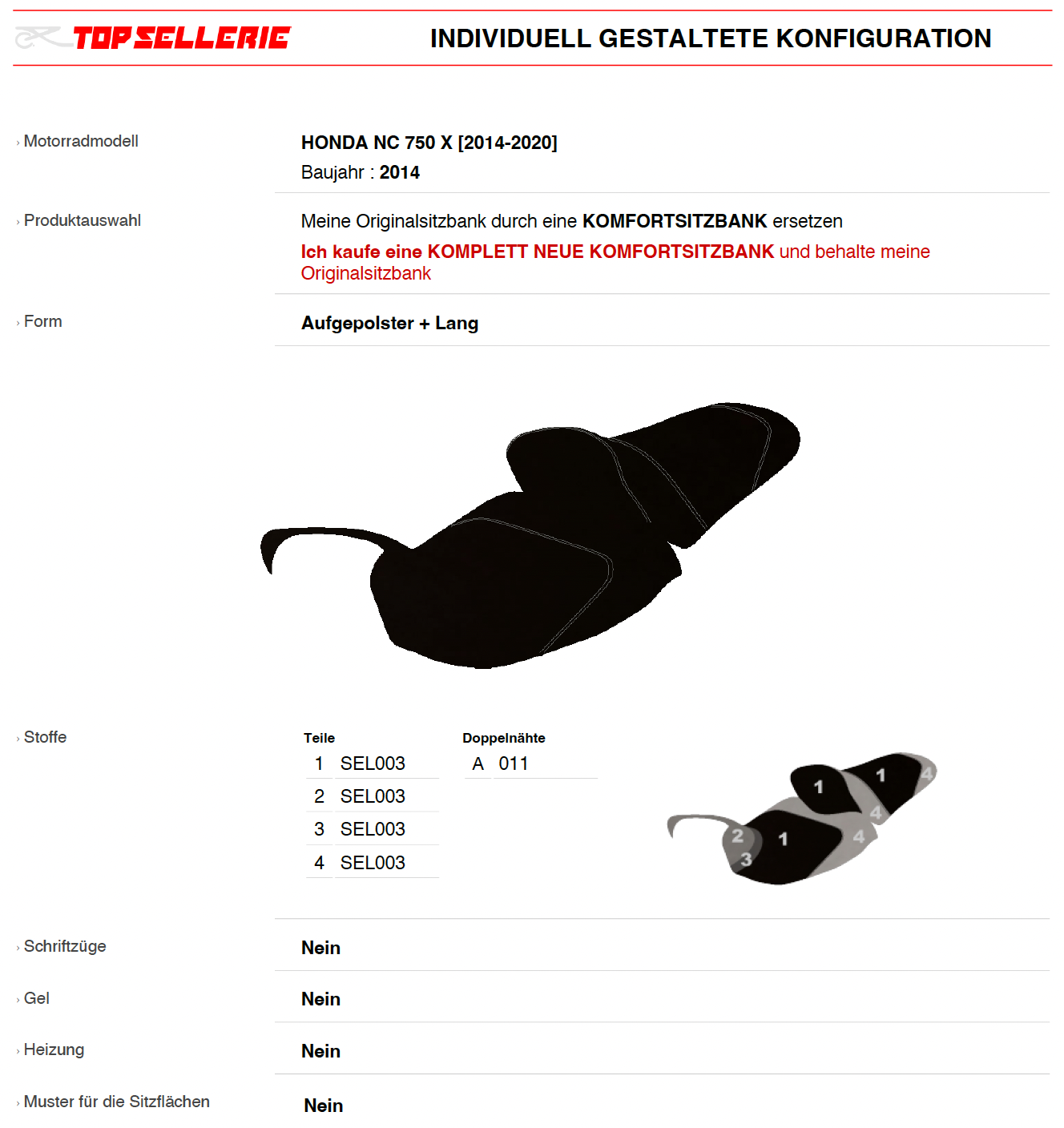 Guten Morgen zusammen, auch ich hatte mir im September eine Sitzbank bei Top Sellerie gekauft. Ich bestellte mir eine komplette zweiteilige Sitzbank aus Alcantara mit Stickereien, Geleinlageund nicht höher machenlassen. Die Lieferung dauerte fast 4 Wochen. Ich bekam immer eine Mail über den Stand der Dinge. Auf eine Anfrage meinerseits bekam ich innerhalb von 24 Stunden eine Antwort. Mit der original Sitzbank (habe mir die RH09 im Juli neu gekauft) konnte ich gerade mal + - eine Stunde fahren bis sich mein Sitzfleisch gemeldet hatte und meinte es bräuchte mal eine Pause. Mit der neuen war ich vor kurzem einen ganzen Tag auf Tour gewesen und außer tanken machte ich keine Pause. Mein Hintern hatte sich überhaupt nicht gemeldet. Die Sitzbank ist nicht zu hart aber auch nicht zu weich. Mein Frau meinte sie würde jetzt auf einen Sessel sitzen. Das einzige was ich zu bemängeln hatte war, dass der Stoff (bei der Soziusbank) zu lang über den Verriegelung Haken ging und somit die ließ sich die Sitzbank nur schwerfällig öffnen und schließen. Mit einem Cutter habe ich an der Stelle einen Kleinen Riß geschnitten und um geklappt. Somit war das erledigt. Mit dem Kauf dieser Sitzbank habe ich alles richtig gemacht. Ich würde sie jedem empfehlen der mit seiner Sitzbank Probleme hat.