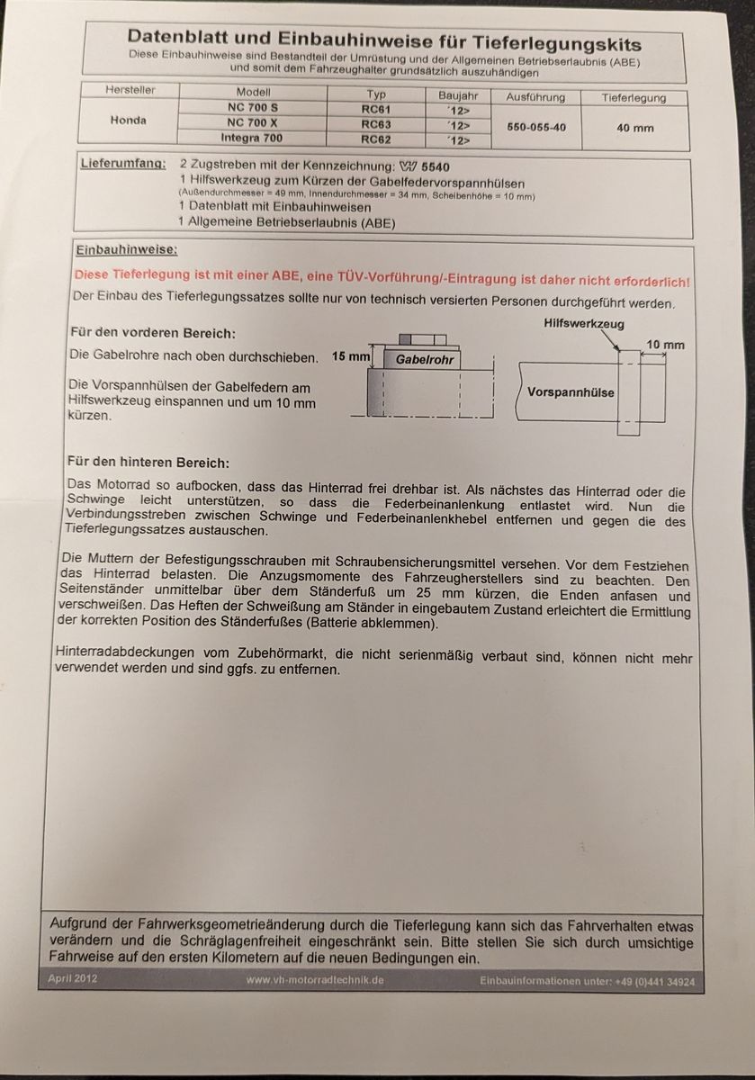 Ich kann nur sagen, was in der Einbauanleitung von VH steht: Zugstreben einbauen (sind wohl 4cm tiefer), Gabelrohre um 15mm durchschieben, Vorspannhülse um 10mm kürzen und Seirenständer um 25mm kürzen und wieder Zusammen schweißen