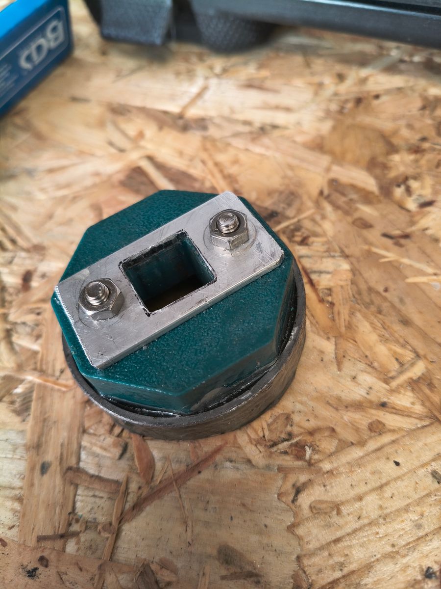 Die einfachere Lösung wäre es, einen Blechschlüssel zu nehmen. Kann man sich selbst machen oder für 20 EUR kaufen. Zum Lösen der Stopfen muss man dann aber die Gabel ausbauen oder weit durchschieben. Ich wollte eine Lösung, die mit eingebauter Gabel funktioniert.