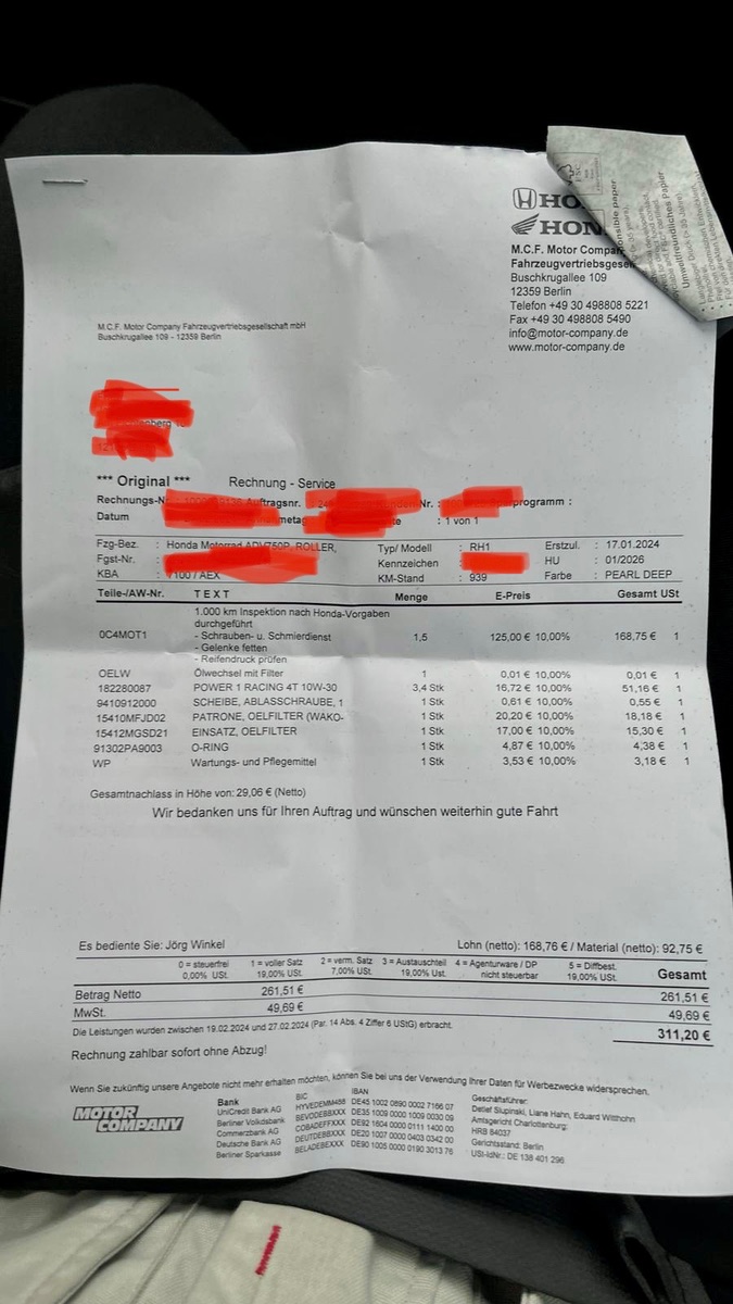 Wir hätten in Berlin für den 1000er Ölwechsel sage und schreibe 340€ bezahlen müssen. Nachdem ich mich darüber aufgeregt habe, haben sie uns 10% erlassen. Trotzdem waren es noch 311€. Dies steht für einen ganz einfachen Ölwechsel nicht im Verhältnis. Begründung von Motorcompany: es müssen die Kette und Gelenke gefettet werden und alle Schrauben werden nachgezogen. Ich habe dann aber rausbekommen, dass die 1000er KEINE Inspektion, sondern ein reiner Ölwechsel ist…mit Überprüfung der Kettenspannung. Kette fetten und nachziehen/fetten der Schrauben u. Lager stehen erst bei der 12Ter Inspektion an. Es wurden uns auch 1,5h berechnet, anstatt 1,4h. Aber gut…es gibt ja noch mehr Händler, die hoffentlich faire Preise machen .