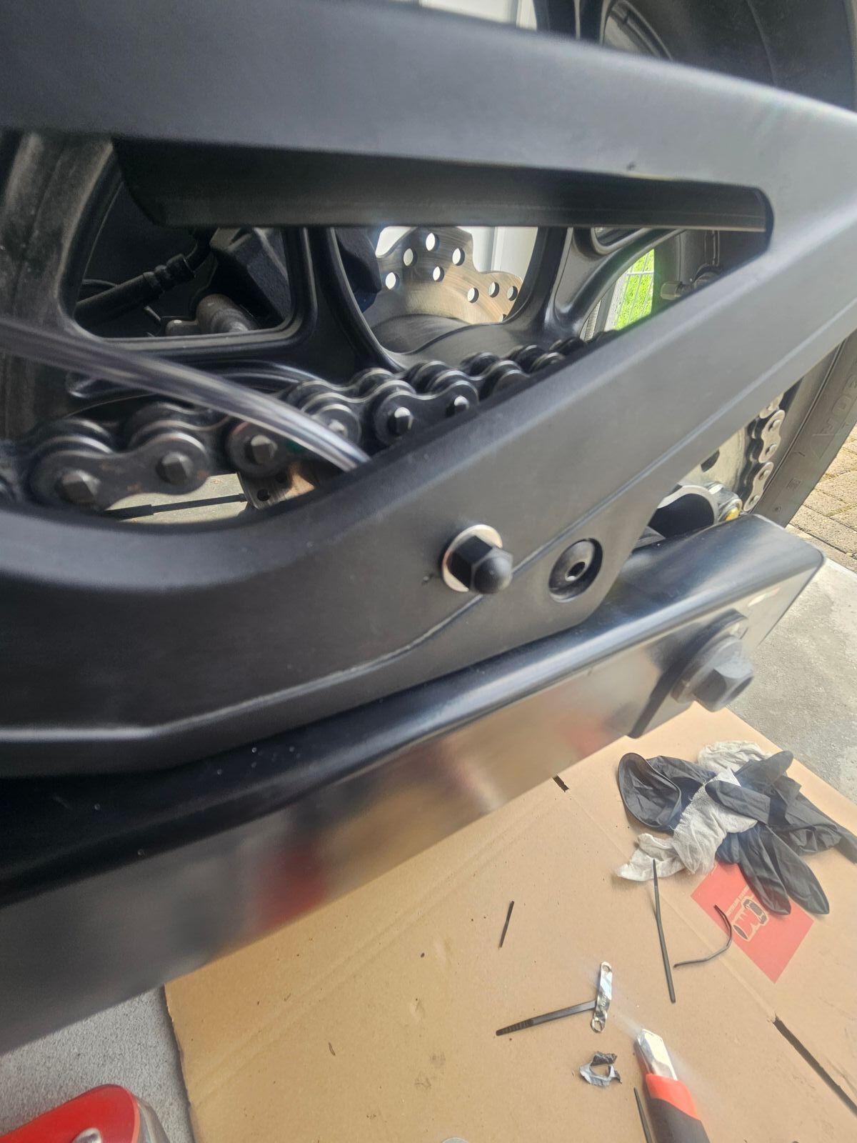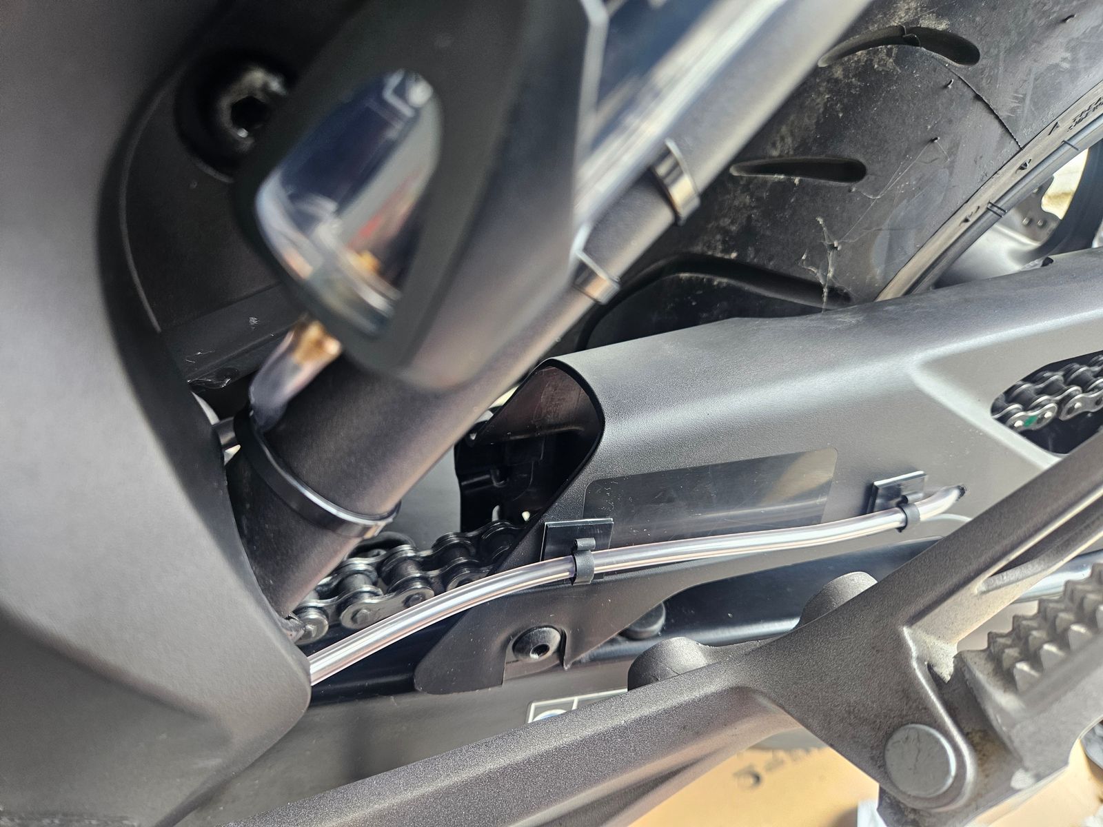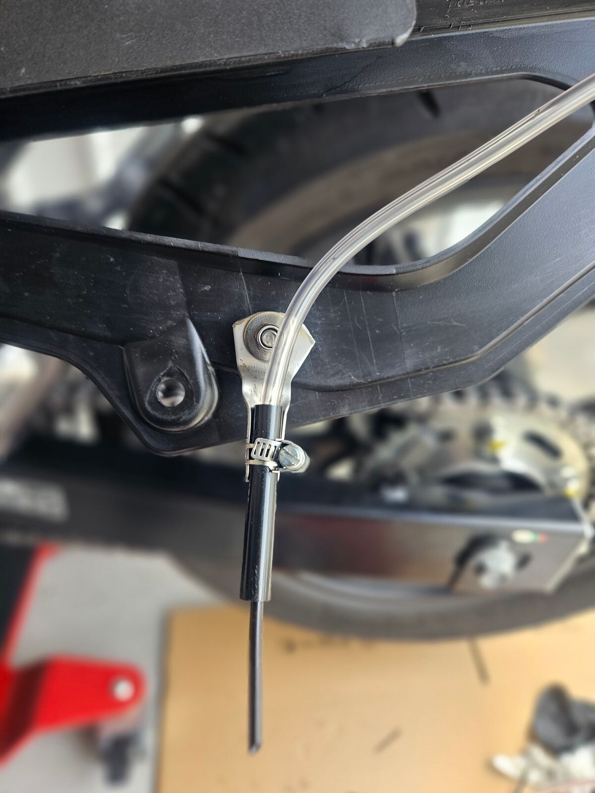 Den Ölschlauch wollte ich nicht einfach so an der Schwinge entlang nach hinten legen und dann mittels der Achsmutter ö.ä. befestigen.