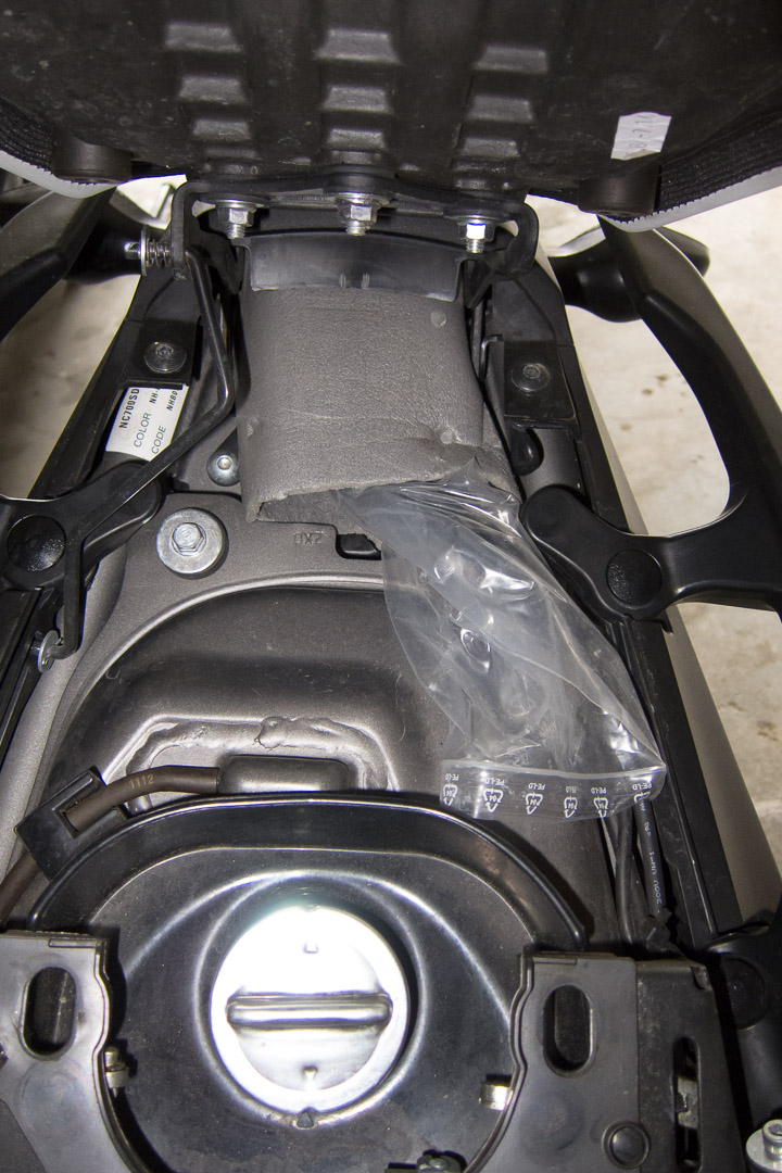 Motorgehäuse auf. Die Entlüftungsleitung und eine Füllleitung habe ich hinter die Wartungsöffnung im Tankfach verlegt. Von dort kann
