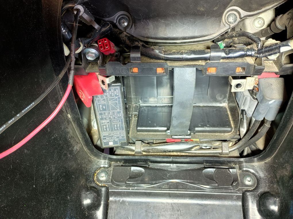 Jetzt habe ich noch einen roten Stecker (4p) links oberhalb der Batterie, an dem irgendwas abgezweigt wurde (Zündungsplus?)?