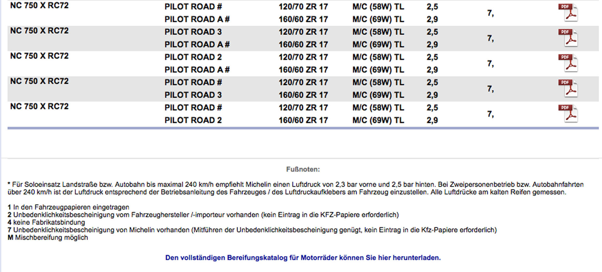 Bitte hier steht es, da ich gerade mal 67 kg wiege und an meiner NC auch nichts weiter an Zubehör dann ist, fahre ich bei den Temperaturen auch nur 2,3 / 2,5 Bar, hat den Vorteil dass der Reifen schneller auf Temperatur kommt und schlingern tut er mit dem Luftdruck noch lange nicht. -